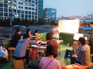 그래서 새로운 미디어를 고안해보고, 저자적인 포텐을 폭발시켜 다양한 출간 방식을 실험하려고 ‘진 스프린트’(Zine Sprint)라는 프로그램을 가동해봤다. 진(Zine), 쉽게 얘기하면 로테크로 만드는 자가 출판물을 가리킨다. 책자·팸플릿을 지칭하는 것을 넘어 CD, 포스터, 스티커, 메시지를 담은 티셔츠까지 폭넓은 미디어를 ‘진’으로 정의할 수 있다. 한마디로 진 스프린트는 ‘자가 출간물을 단거리 질주하듯 만들어보자!’라는 것이다. 이 프로그램을 위해 미디어 아티스트와 소프트웨어 개발자부터 활동가, 커뮤니티 공간 운영자까지 다양한 이들이 모여들었다. 서랍에 글을 새긴 책상-책, 담벼락에 시멘트로 슬쩍 고정해둔 USB(지나가는 사람이 노트북에 꽂으면 그 내용을 읽을 수 있다. 시간이 갈수록 야동이 채워졌다나 ㅡ.ㅡ), 구글 독스를 이용해 온갖 비문과 오타를 제보받고 그걸 트위터로 퍼트리는 ‘월간 언어도단’(읽어보길. 저자는 허르만 허세라는 시인이다), 테이프처럼 만들어 어디든 붙일 수 있는 책까지, 흥미로운 사례가 여름밤 옥상에서 발표됐다.