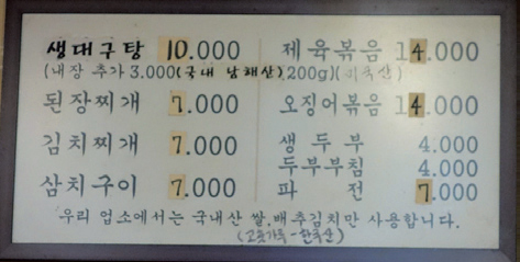 저녁 먹을 때면 으스름이 내린다. 계절이 그 계절이다. 서울 인사동에 생태탕을 먹으러 갔다. 아주머니는 대구로 바꾸었노라고 그랬다. 이미 메뉴판도 명태를 지웠다(사진). 계절 따라 입이 기억하는 것은 있어도 세상 물정은 몰라도 한참 몰랐다. 한국에서 주로 생태로 들어오던 것은 일본산이다. ‘원산지 일본’은 이제 해산물에서라면 금어다. 후쿠시마 방사능 유출 사고 이후 모르면 먹어도 알고 나면 꺼리게 된 게 생태다. 더군다나 한국에서는 더 이상 명태가 잡히지 않으니 말이다.