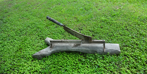 응달에는 잔디 세가 약하고 자연스럽게 뱀딸기풀이 번진다. 어머니가 소여물 썰던 작두를 뱀딸기풀 위에 놓아 연출해보았다. 강명구 제공