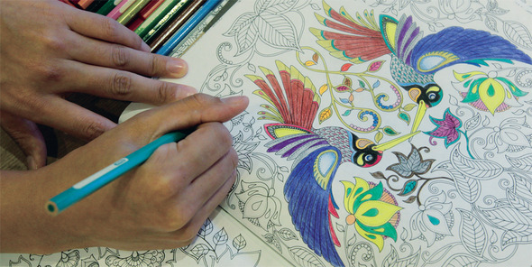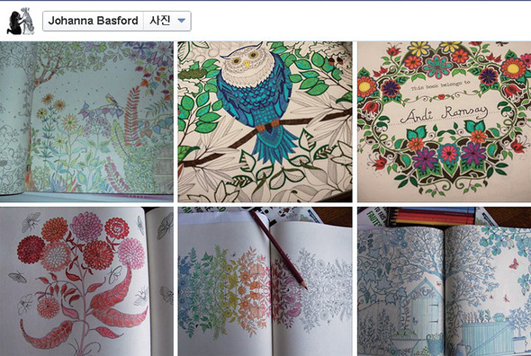 스마트폰을 들여다보는 대신 다양한 색칠 도구로 여러 가지 밑그림에 색깔을 채워넣는 ‘색칠놀이’가 성인들 사이에서 유행하고 있다. ‘어른들의 색칠놀이’는 잡념으로부터의 자유를 선물하는 동시에, 자신만의 ‘예술작품’을 완성하는 쾌감도 준다(위). 〈비밀의 정원〉의 작가 조해너 배스포드의 페이스북에는 전세계 사람들이 작업한 ‘작품 사진’이 매일 올라온다(아래).