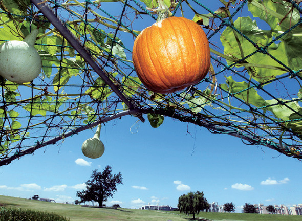 가을 하늘 아래 호박이 무겁게 영글어가고 있다.