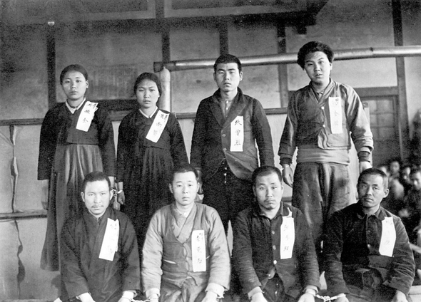 △ 사진/ 혜산진 사건으로 일제에 검거된 권역병(앞줄 맨 오른쪽)등 보천보사건의 주역들. 일제는 관헌자료를 통해 "항일련군의 위력을 조선 민중에게 주지시켰다"고 인정했다.