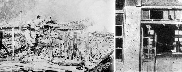 △사진/ 김일성 부대에 보천보전투는 너무 일방적으로 쉽게 끝나 아쉬운 전투였다. 보천보전투 뒤 불에 탄 일제기관(왼쪽). 경찰주재소엔 총알자국이 선명하다(오른쪽).
