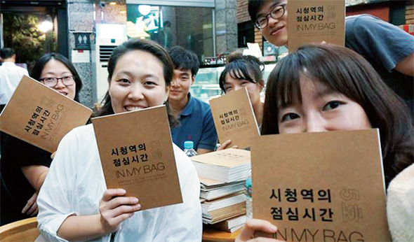 지난해 8월 페이스북이나 ‘집밥’ 등 소셜 모임 사이트 등에 ‘일터 동네 잡지’를 만드는 <시청역의 점심시간>을 알리는 글을 올렸다. 처음에는 한 달짜리 강좌 형태였다. 점심을 먹으면서 주제에 대해 이야기하고 글을 쓰고, 잡지를 만들어 출간 파티까지 하는 일정이었다. 9월에 사람들이 모였다. 시청역 부근에 있는 대기업에서 일한 지 만 6년에 접어들던 심정선(38)씨에게 그 ‘모집글’은 “적적한 회사 생활에 활력소가 되지 않을까” 하는 기대감을 갖게 했다. 심씨는 회사에서 동료가 많지 않은 부서에서 일한다. 그래서 혼자 밥 먹는 일이 많다. “처음에 <시청역의 점심시간>을 보고 반상회 한번 가볼까 하는 느낌이었어요. 실제로 그래요. 밥벌이와는 별 상관 없는 주제를 놓고 때로는 진지하게, 때로는 시답잖은 농담도 하다가 다시 일터로 돌아오면 적적했던 마음이 훈훈해져요.”