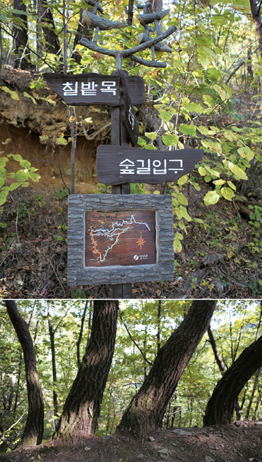 일월산자생화공원에서 우련전까지의 외씨버선길 일곱째 길 곳곳에서 만나게 되는 길 안내 간판은 초행자를 위한 대티골 사람들의 배려이자 마을의 내력을 알려주는 가이드북이다(위). 외씨버선길 치유의 길에서 만나게 되는 소나무. 비록 굽을지라도 생명을 포기하지 않는 강인한 정신을 일깨워준다.