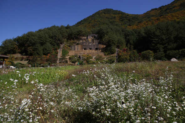 일월산자생화공원. 1939년부터 가동된 용화제련소는 1976년 가동을 멈췄지만 2001년에 들어서야 겨우 오염원을 밀봉하는 조처를 거쳐 자생화공원으로 거듭났다(왼쪽). 시인 조지훈의 생가 호은종택이 있는 주실마을 전경. 마을이 배 모양이라 배에 구멍을 내