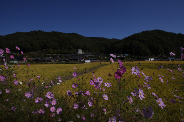 숲을 지나 주실마을로 들어서는 잘 닦인 길을 버려두고 코스모스의 유혹을 받아들여 둑길을 지난다. 조지훈 생가로 마을이 유명세를 타면서 마을 사람들이 조성한 꽃길이다. 키만큼 자란 코스모스는 빽빽할 정도로 잘 자라 바람이 없어도 지나는 이의 뺨을 애무한다.
