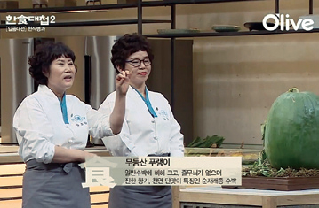 <한식대첩 시즌2>는 시즌1에 비해 예능적 성격이 강화된 모습이다. 새 진행자 김성주부터 분위기를 띄우는 데 일조하고, 각 지역팀 캐릭터에도 힘을 주었으며, 자막 비중이나 배경음악 사용도 늘어났다. 평범한 이들의 입맛을 대변할 ‘일품식객’이라는 이름의 연예인 게스트가 출연하기도 한다. 그래서 자연스럽게 예능감이 뛰어난 출연자들에게 눈이 쏠린다. 이번 시즌에는 캐릭터를 강조한 덕인지 개성이 두드러지는 도전자가 많아진 느낌인데, 유일한 남성 콤비 도전자였던 제주팀, 카리스마의 북한팀, 자신감의 전남팀 등이 초반부터 눈에 띄었다. 이 가운데 안타깝게도 제주팀과 북한팀은 일찌감치 탈락했고, 현재는 전남팀이 남았다. 전남의 떡갈비 명인 김효숙·김갑례 도전자는 떡갈비처럼 차진 입담으로 큰 웃음을 준다. 걸쭉한 사투리로 비속어도 거침없이 사용하고, 지역 일품 재료를 설명할 때의 자부심 어린 표현은 마치 남도 판소리의 한 대목을 보는 듯 유쾌하고 구성지다. 일품 재료를 먼저 맛보게 하면 결과가 좋지 않은 징크스를 발견했다며 맛보기를 간청하는 김성주를 들었다 놨다 할 때는 근엄한 심사위원들도 웃음을 참지 못할 정도다. 무엇보다, 이들의 당당한 캐릭터를 응원하는 이유는 심사위원과 도전자의 위계적 관계가 명확한 다른 서바이벌과 달리 고수로서의 자존감이 강하게 보이는 <한식대첩>의 특징을 가장 잘 드러내는 참가자이기 때문일 것이다. 그래서 매회 이들의 말을 빌려 응원하게 된다. ‘전남팀 고수님들! 1등 나부러~.’