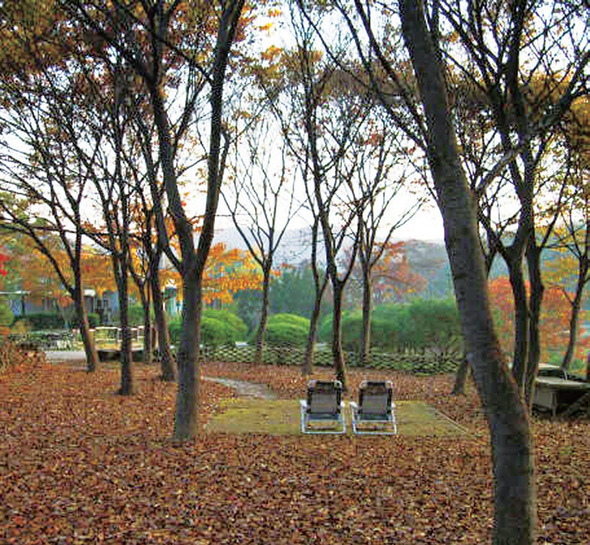 이제 몇 주만 지나면 느티나무 밭 낙엽 위에 만추의 멜랑콜리가 쌓이리라. 숲 사이에는 여름에 즐겨 사용한 해먹이 걸려 있다. 강명구 제공