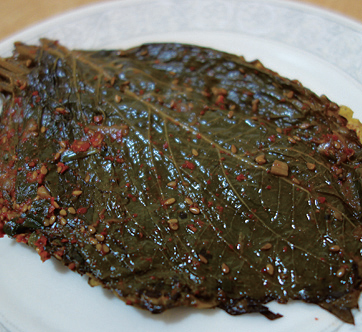 큰 항아리에 깻잎을 7부쯤 차곡차곡 담고 소금물을 아주 짭짤하게 풀어 붓고 위에 짚 또아리를 올려 납작한 강돌로 눌러놓습니다. 잘 삭으면 헹궈서 쌈을 싸먹기도 하고 들기름 양념해 밥솥에 얹어 쪄먹기도 합니다. 큰 장뚜가리(뚝배기)로 한가득 양념해 솥에 물 붓고 중탕할 때는 밥도 먹기 전에 맛있는 냄새가 나서 코를 발름발름하며 숨을 깊게 들이마십니다.