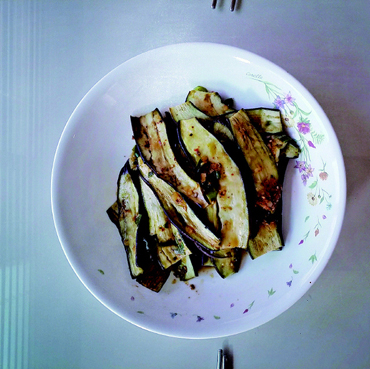 뮤지션이 만든 가지구이 반찬. 보기엔 그럴듯하지만 가지는 충분히 익지 않았고 양념은 너무 짰다. s기자