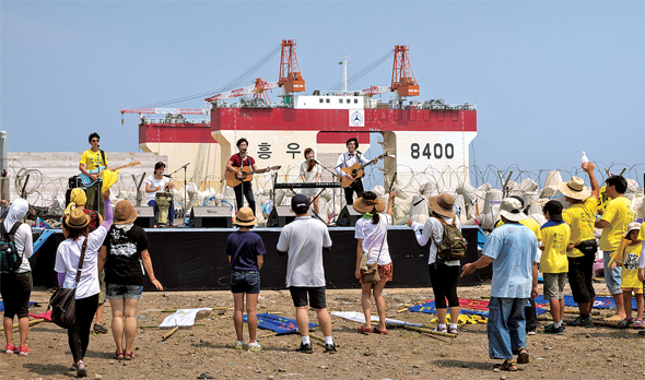 2013년 제주도 강정마을에서 한 인디밴드가 관객들 앞에서 공연을 하고 있다. 박승화 기자
