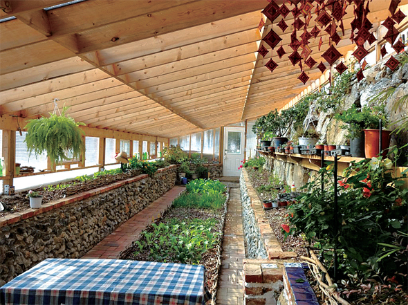 기존 돌 축대를 벽으로 하여 지하 1m를 파고 들어간 뒤 나무 프레임을 얹고 프레임을 투명 재질 이중 플라스틱으로 감싸서 지은 반지하 온실의 제1의 목표는 겨울철 무가온(無加溫) 식물 재배였다. 결론부터 보고하자면 약간의 주의를 요하는 수준의 상당한 성공이다. 온도부터 보자. 짧은 지면에 기록한 데이터를 일일이 제시하기는 힘들지만 대체로 외부 온도와 10℃를 약간 상회하는 정도의 온도차를 보였다. 밖이 영하 10℃면 온실 안의 최저 기온은 창가는 0℃, 석축이 있는 벽 쪽은 영상 3∼4℃ 정도였다. 물론 변온 정도가 일정치는 않아 밖이 영하 15℃일 경우 실내에선 창가는 영하 2℃, 석축 부분은 영상 2∼3℃가 되었다. 하지만 영하 10℃ 안팎의 추운 날씨에서도 최저 기온은 항시 영상을 기록했다. 한낮에는 아무리 추워도 볕만 비치면 영상 27℃까지 올랐고 습도는 75% 내외였다. 아마 2월만 돼도 30℃를 웃돌 것이다. 참고로 벽과 창문의 미세한 틈까지 꼼꼼하게 밀봉한 효과가 크다는 짐작이다.