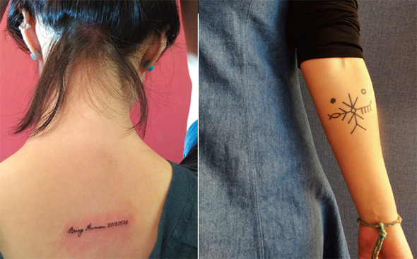 타투는 한 번 새기면 지울 수 없다. 그 때문에 오히려 타투를 새기는 이들이 늘고 있다. 정인옥(왼쪽)씨는 아들의 탄생을 기념하며 그 생일을 목 뒤에 새겼고, 녹색당 당직자 안가영(오른쪽)씨는 환경과 생명을 고민하며 ‘생명평화무늬’를 팔에 아로새겼다. 정인옥 안가영 제공