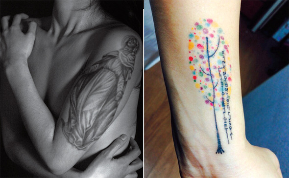 타투 합법화를 둘러싼 해묵은 논쟁이 박근혜 정부 들어 ‘지하경제 양성화’ 정책과 함께 재점화되고 있다. 성모 마리아 문신을 새긴 모델 정규리(왼쪽)씨와 좋아하는 경구를 나무와 함께 새겨넣은 박보현(오른쪽)씨. 사진작가 한욱희 제공, 박보현 제공