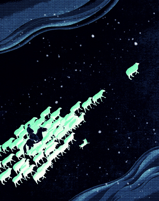 이상한 양을 따라가는 건 쉬운 일이 아니었다. 일단 개가 그 꼴을 용납 못해서 냉큼 달려가 짖어대기 일쑤였고 염소떼도 전날의 맹약과 달리 새 길잡이에게 무리의 주도권을 내줄 생각이 없어 보였다. 그 말인즉 개와 염소를 훈련해야 한다는 뜻이었다. 그러느라 거의 닷새를 까먹었다. 엿새째에야 비로소 원정이 시작됐다. 아무도 그 양놈을 막지 않는 가운데, 양떼가 생각 없이 그 뒤를 따랐다. 말리지만 않으면 늘 혼자 저 멀리 앞서가 있는 놈이었으므로 그놈이 양 무리를 이끌게 만드는 건 어렵지가 않았다. 짐승들은 알아서 그 뒤를 따랐고 나도 따로 신경 쓸 일은 없었다. 그냥 고삐를 느슨하게 쥐고 말 등에 앉아 있기만 하면 생각 없는 말놈이 덩달아 그 뒤를 따르게 되어 있었다.