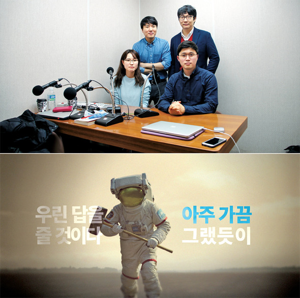 자본주의와 공산주의, 데카르트·키르케고 르·세종대왕,신비체험, 외계인, 우주의 탄생 등 “살면서 누구나 한번쯤은 궁금해하지만 아무도 정확히 알려주지 않는 주제들”을 갖고 쉽고 편하게 대화하는 팟캐스트 ‘지적 대화를 위한 넓고 얕은 지식’을 꾸려가는 4명의 패널들. 왼쪽 아래부터 시계방향으로 김도인·채사장·독실이·깡선생(위). “우주에서 가장얕다”는 점을 내세워 광고하는 모바일 콘텐츠 큐레이팅 앱 ‘피키캐스트’의 텔레비전 광고 장면(아래). 지대넓얕 제공, 피키캐스트 제공