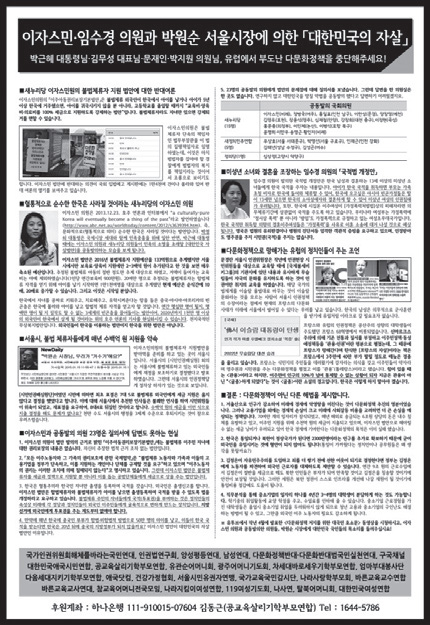 국가인권위원회해체를바라는국민연대, 남성연대, 공교육살리기학부모연합 등이 <동아일보>와 <중앙일보>에 지난 1월19일 낸 의견광고의 일부다. 광고의 제목은 ‘이자스민·임수경 의원과 박원순 서울시장에 의한 「대한민국의 자살」’. 이 법을 ‘불법체류자 지원법’이라고 부르는 광고는 “혈통적으로 순수한 한국인은 사라질 것이라는 새누리당의 이자스민 의원”이라는 내용으로 이어진다. 외신 인터뷰 내용을 부적절하고 부정확하게 인용하고, 이주아동권리보장기본법의 내용을 침소봉대하는 것이다. 아이러니하게도, 새누리당 의원은 우익단체의 공격 타깃이 되었다. 의무교육을 받는 미등록(불법체류) 이주아동의 경우, 한쪽 부모의 한국 체류를 허용하는 ‘출입국관리법 일부개정법률안’을 발의한 임수경 의원도 광고에서 졸지에 “미성년 소녀와 결혼을 조장하는 임수경 의원”이 되었다. 이렇게 조직된 광고와 1만4193건 의견은 맥락이 다르지 않다.
