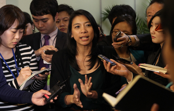 새누리당 비례대표로 제19대 국회의원에 당선된 이자스민씨가 17일 오후 국회에서 최근 ‘인종차별논란’에 대한 입장을 밝히고 있다. 강창광 기자 chang@hani.co.kr