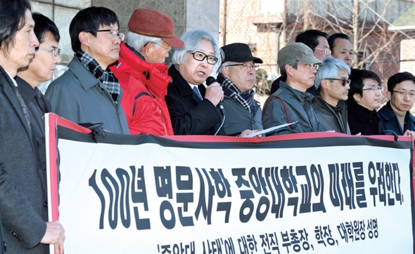 중앙대 전직 부총장, 대학원장, 단과대학장 등이 지난 3월10일 서울 동작구 중앙대에서 2016년학년도 학과제 전면 폐지를 골자로 한 ‘학사구조 선진화 개편안’에 대한 비판 입장을 담은 설명을 발표하고 있다. 한겨레 이정아 기자