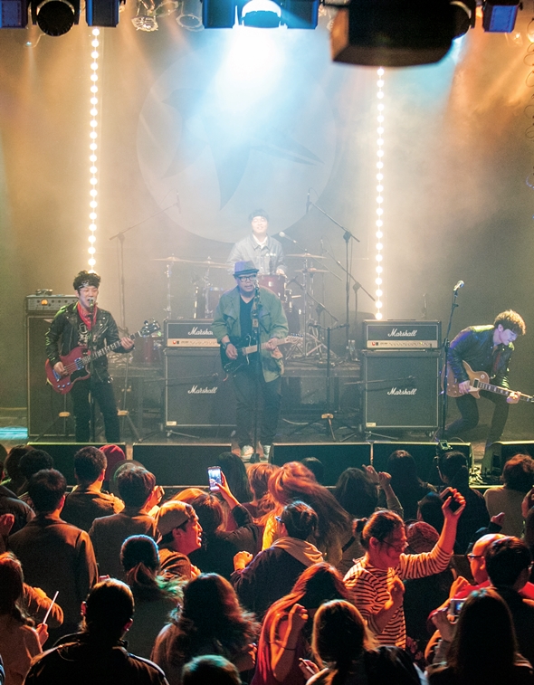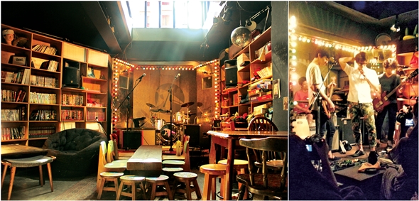 제비다방의 지하 공연장. 14평 남짓한 작은 공간에서 ‘무료 입장, 유료 퇴장’ 공연이 이어진다(왼쪽). 이 공간에서 공연하고 있는 밴드 파블로프. 제비다방 제공, 이정연 기자