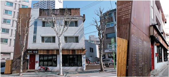 제비다방의 오랜 친구 김간지는 김힙합이라는 예명으로 컴필레이션에 참여해 예술가와 예술을 제대로 즐길 줄 아는 어른들의 놀이터가 되어가는 제비다방의 외관(왼쪽). 제비다방 바깥 벽에는 공연 일정이 빽빽하게 적혀 있다. 제비다방 제공