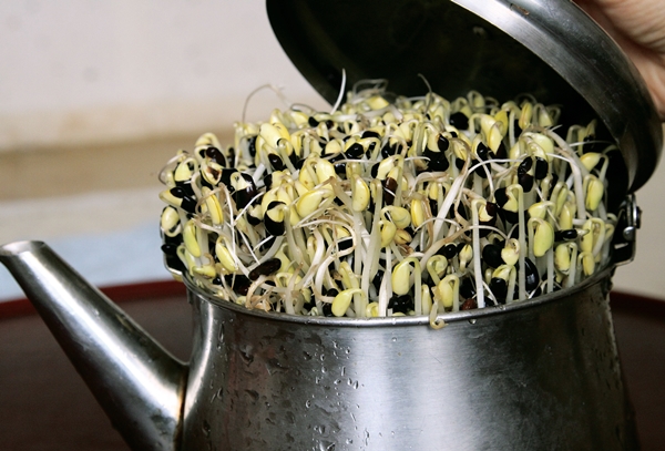 콩나물 기르는 일은 참으로 쉬운 일이다. 시루에 3분의 1 정도 들어갈 양의 콩을 하루 정도 물에 불리면 콩알이 갈라지고 그 틈으로 작은 뿌리를 내민다. 이렇게 싹이 트면 소쿠리에 담아 물기를 빼내고 시루 바닥에 물 먹인 볏짚으로 똬리를 틀어 깔아준 뒤 그 안에 불린 콩을 담는다. (볏짚은 시루 안에 적당한 수분을 유지하기 위해 깔아주는 것인데 스폰지 역할을 한다.) 시루가 준비되면 아랫목 구석진 자리에 물이 담긴 함지박을 놓고 시루를 걸칠 수 있는 받침대로 사용할 ‘꼬작’을 가로질러 얹은 뒤 그 위에 콩나물시루를 올린다. 그리고 함지박에 담겨 있는 물을 시시때때로 부어주고 빛 한 줄기 새어들지 않을 만한 검고 두꺼운 천으로 시루를 덮어주면 노랗고 실한 콩나물이 자라는 것이다.