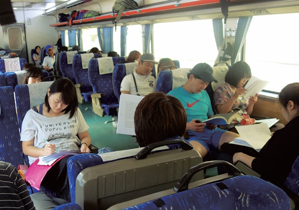집에 돌아갈지 어떨지 모른 채 웃고 있는 ‘낭만독자 열차교정’ 이벤트 참가자들. 북스피어 제공