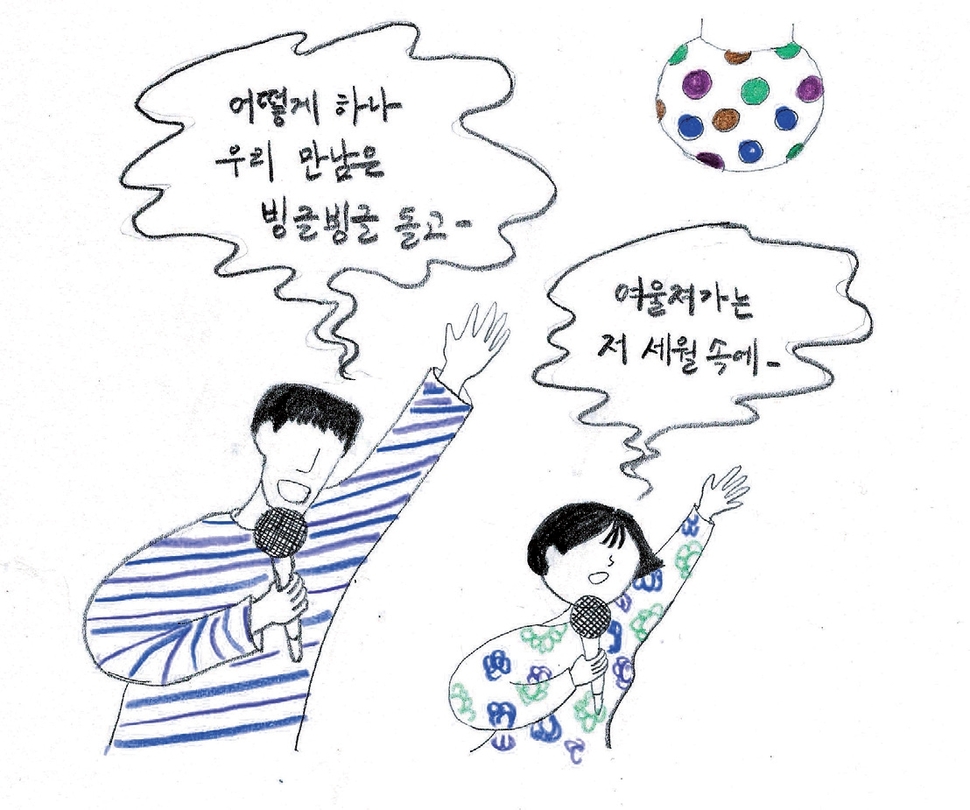 손님들이 떠난 뒤 설거지를 하며 내가 중얼거렸다. 우리 친구들은 어쩜 하나같이 노래를 다 잘할까. 식탁을 닦던 미래의 록스타가 대답했다. 우리만 듣기 아까우니까 친구들을 모두 모아놓고 노래를 시키자. 결국 우리는 며칠 뒤 지하 술집 하나를 통째로 빌렸다. 친구들을 부르자 20~30명 정도가 왔다. 그 파티의 이름은 ‘가요잔치’였고 그날도 역시 한 명씩 돌아가며 노래를 시켰다. 친구들은 우리의 흥이 피곤하다고 투덜대면서도 무대에 올라와 기깔나게 한 곡씩을 뽑았다. 집에 가는 길에 친구 한 명이 말했다. “너희의 연애는 금방 소진되고 말 거야.” 나는 고개를 끄덕였다. 그러나 아직 흥이 남아도는 것은 어쩔 수 없었다.