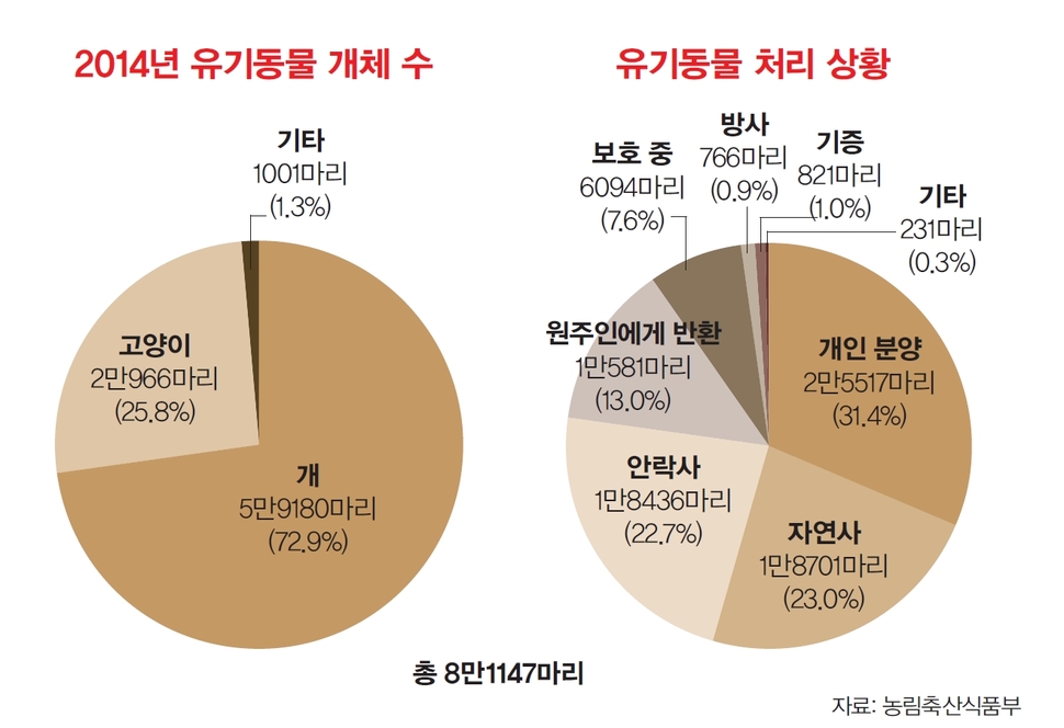 2014년 8만1147마리로 집계된 유기동물 수는 정점을 찍었던 2010년 10만1천 마리 이후 꾸준히 감소하는 추세다. 하지만 동물보호단체 카라의 활동가 한희진씨는 “사설 동물보호소에 있는 동물, 길에서 구조되지 못한 채 죽음을 맞는 동물 등 실제 유기동물 수는 집계된 수를 훨씬 넘어설 것”이라고 말한다.