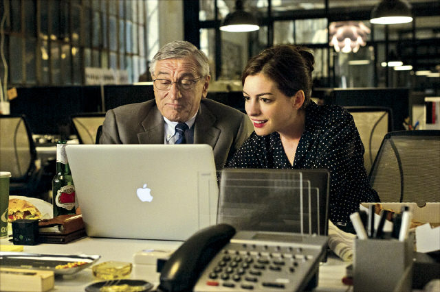 낸시 마이어스 감독의 <인턴>(사진)을 보고 알렉산더 페인 감독의 <어바웃 슈미트>(2003)가 떠올랐다. <어바웃 슈미트>의 워런 슈미트(잭 니컬슨)가 눈물을 닦고 얼굴에 미소를 띠면 <인턴>의 벤 휘태커(로버트 드니로)로 변하지 않을까(아닌 게 아니라, 낸시 마이어스 감독은 <인턴> 주인공 1순위로 2004년 <사랑할 때 버려야 할 아까운 것들>에서 호흡을 맞췄던 잭 니컬슨을 꼽았다).