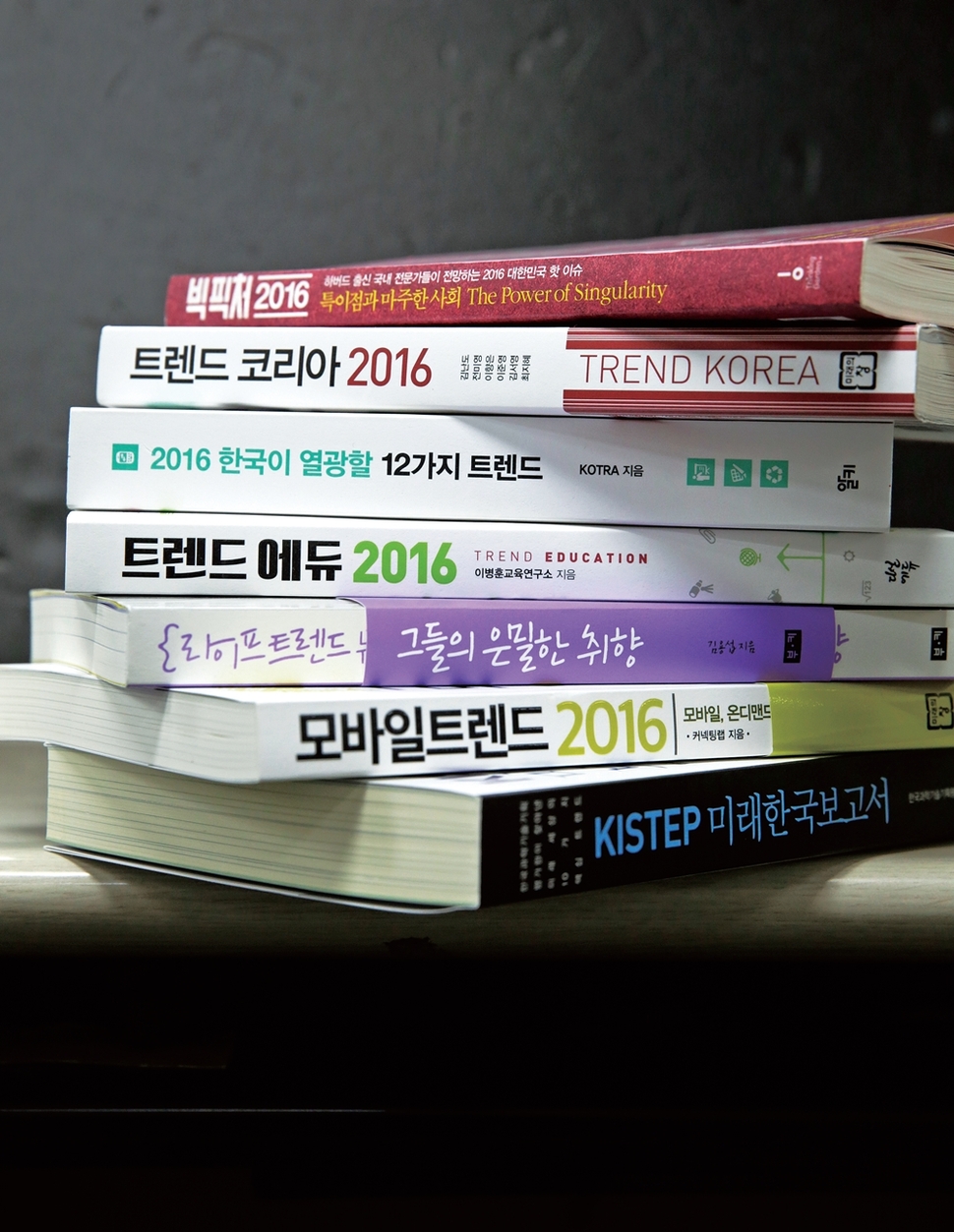 김난도 교수팀이 2016년을 전망하는 키워드들을 꼽은 책 <트렌드 코리아 2016>은 온·오프라인 서점 베스트셀러 10위권에 진입했다. 연말이면 그해에 나온 <트렌드 코리아>가 베스트셀러 수위권을 차지하고, 서점의 좋은 자리에 트렌드 책 서가가 마련되는 풍경은 이제 익숙하다.