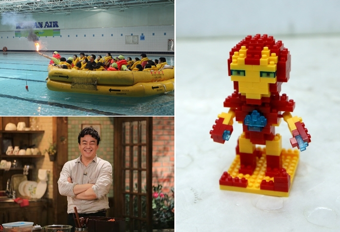 <트렌드 코리아 2016>은 2016년 키워드의 하나로 최악의 사태에 대비하는 구명보트 전략인 ‘플랜 Z’를 꼽았다. (왼쪽 상단부터 시계 방향) 한 항공사가 비행기가 바다에 비상착륙해 구명보트를 타고 탈출하는 훈련을 하고 있다. 비싼 돈 들이지 않고 집에서 놀 수 있는 장난감 나노블록. <집밥 백선생> 같은 요리 프로그램을 통해 제공받은 꿀팁도 외식비를 줄인다. 진에어 제공, 정용일 기자, tvN 제공.