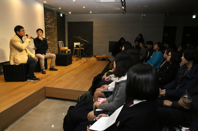 필독콘서트에서 영화 제작 과정을 얘기하고 있는 조정래 감독(왼쪽)과 송호진 기자. 류우종 기자