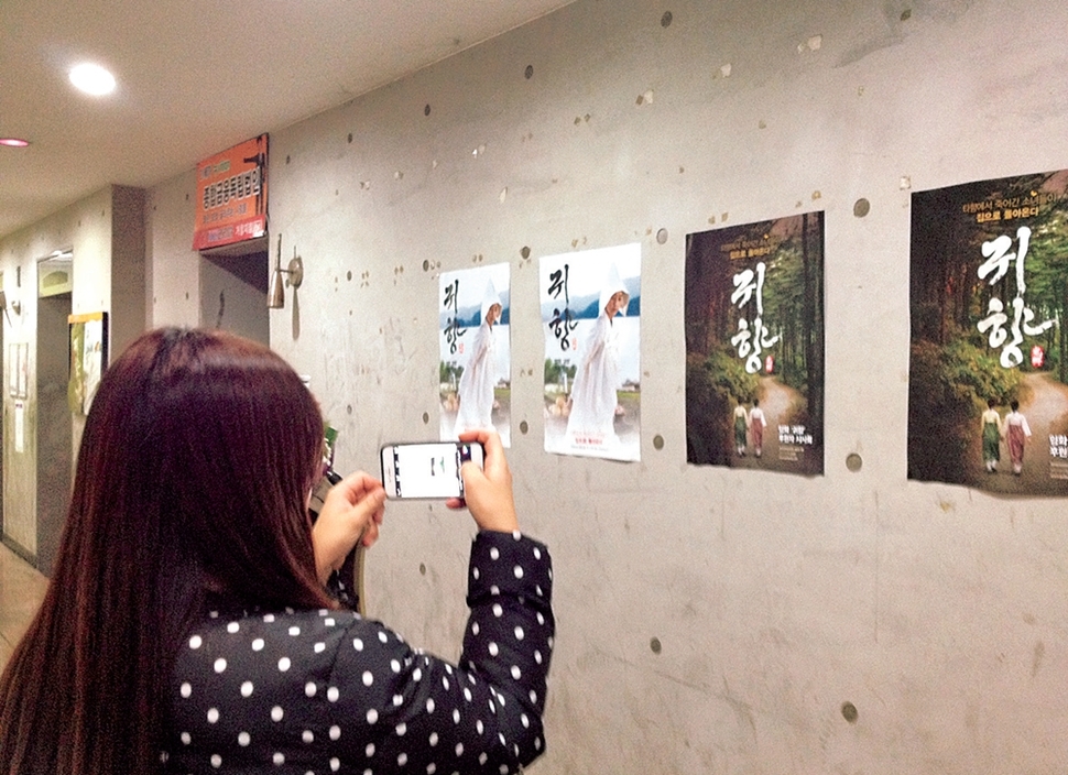 지난 12월10일 경남 거창에서 열린 의 후원자 시사회에 참석한 한 관객이 영화 포스터를 휴대전화에 담고 있다. 송호진 기자