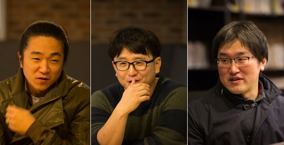 최재윤 이사(왼쪽), 윤성호 감독(가운데), 박관수 대표(오른쪽). 우연치 않게 웹드라마에 모여 을 함께 만든 이들은 농담인듯 사담 아닌 수다처럼 유쾌하게 드라마의 다음 문법에 대해 말했다. 김진수 기자