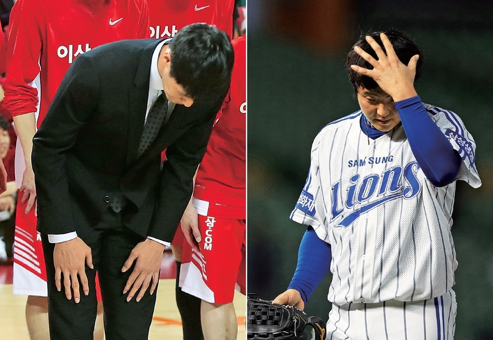 농구선수 김선형(왼쪽)은 승부조작 파문 때문에 고개를 숙이고 팬들에게 사과했다. 야구선수 안지만은 해외 원정 도박혐의로 경찰 수사 중이다. 연합뉴스