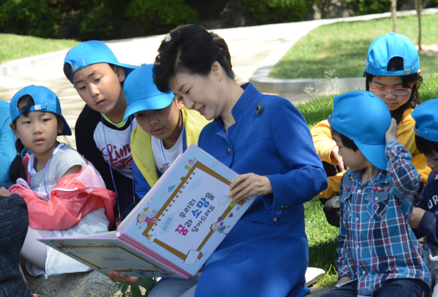 2015년 5월5일 박근혜 대통령이 청와대 녹지원에서 열린 제93회 어린이날 청와대 초청행사에서 어린이들과 그림책을 보고 있다. 청와대사진기자단
