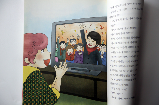 동화책 <국가와 결혼한 첫 여성 대통령 박근혜>에서 주인공 지수가 텔레비전으로 박근혜 대통령의 당선을 지켜보며 기뻐하는 그림. 정용일 기자