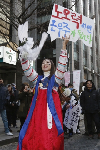 지난해 12월19일 열린 제3차 민중총궐기 ‘소요문화제’에서 한 참가자가 박근혜 대통령의 발언을 풍자한 팻말을 들고 행진하고 있다. 한겨레 이정아 기자