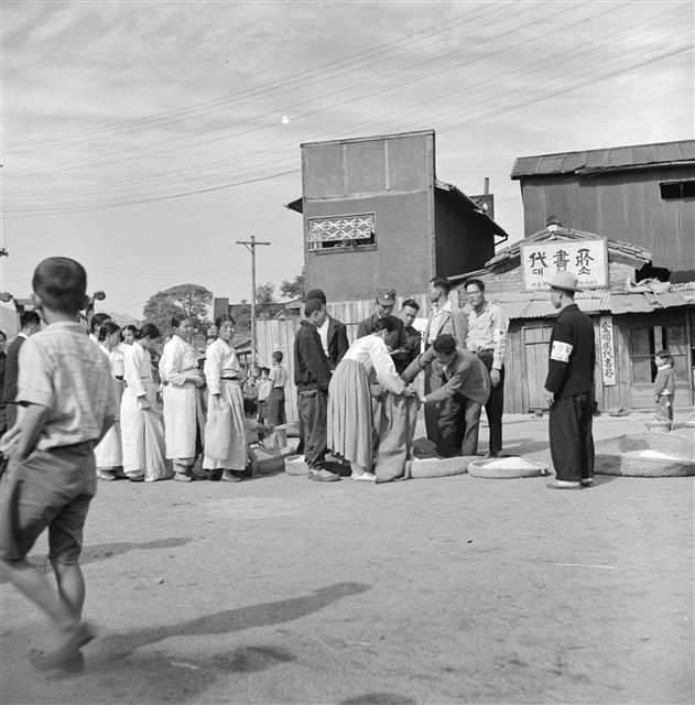 배급받은 식량으로 끼니를 때우던 시절이 있었다. 1951년 한국전쟁 당시 식량배급소에서 쌀을 받는 모습. 연합뉴스