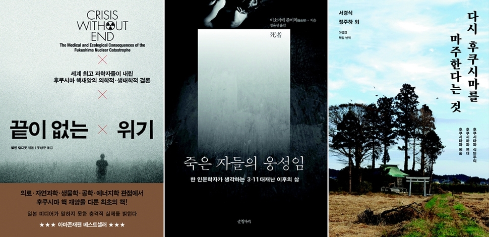 <죽은 자들의 웅성임>(이소마에 준이치 지음, 장윤선 옮김, 글항아리 펴냄). 국제일본문화연구센터 교수인 지은이가 참사 직후인 2011년 4월부터 2015년 1월까지 재난 지역을 찾았던 경험을 담았다. 종교인, 기자, 마사지사, 이발사, 제과사, 의사, 택시기사…. 책은 지은이가 만난 이들과 나눈 대화의 기록이자, 숨진 이들에게 올리는 진혼곡이며, 희생자를 필요로 하는 일본 국가 시스템을 향한 냉철한 비판의 결과물이다.