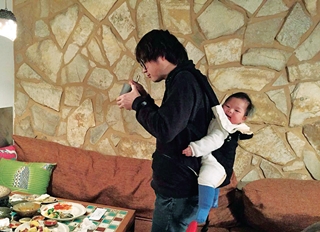 아기와 함께 하는 식사는 전쟁이다. 남편이 아기를 업은 채 힘겹게 밥을 먹고 있다. 송채경화 기자