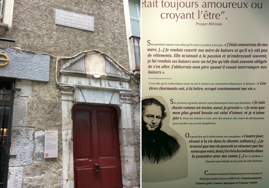 그르노블의 자랑은 단연 스탕달이라 그르노블3대학을 스탕달대학으로 부르며 옛 시청사에다 기념자료실을 두고 있다. 그의 생가는 장자크 루소가(街) 14번지의 4층 건물 중 2층이지만 표지판만 남았다.