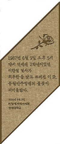 파렴치한 정권의 최루탄에 그가 쓰러진 자리. 피격 지점을 알리는 동판(사진)이 6월9일 드디어 땅에 박힌다. 정확한 설치 지점은 연세대 정문 큰 기둥 2개 가운데 왼쪽 기둥 앞 바닥이다. 동판에 새겨진 글귀. “1987년 6월9일 오후 5시 당시 연세대 2학년이었던 이한열 열사가 최루탄을 맞고 쓰러진 이곳, 유월민주항쟁의 불꽃이 피어올랐다.” 이날 추모문화제에서는 열사의 셋째누이 딸(성균관대 재학)이 친구들과 함께 삼촌을 기리는 노래 공연을 한다.