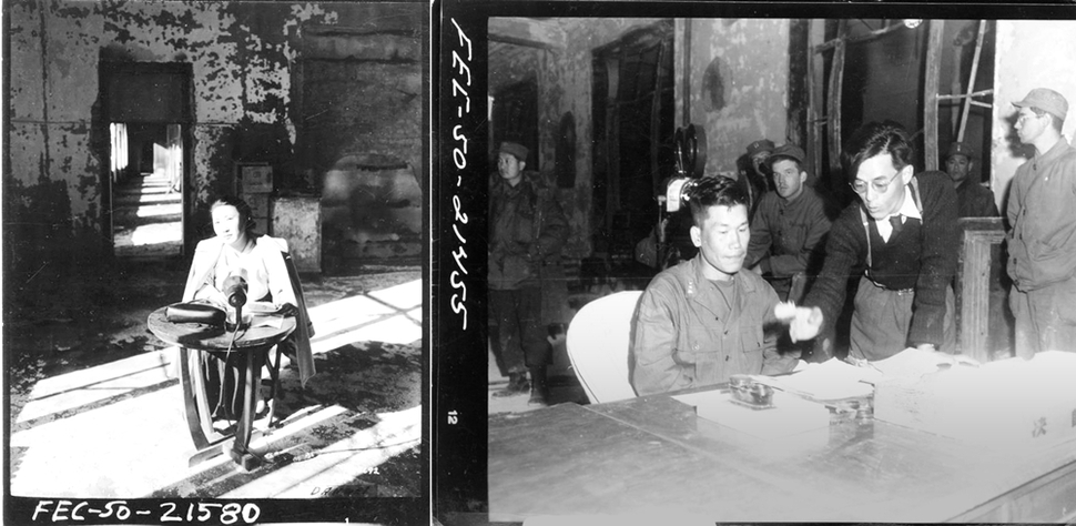 1950년 ‘반공 프로파간다’를 내세운 영화들에 각각 출연한 시인 모윤숙(왼쪽)과 육군 특무대 김창룡 대령(의자에 앉은 사람). 김창룡의 오른쪽 인물은 1950년대 멜로영화의 거장이던 홍성기 감독. 모윤숙과 김창룡은 2009년 민족문제연구소가 펴낸 <친일인명사전>에 등재돼 있다. <한국전쟁 사진의 역사사회학>