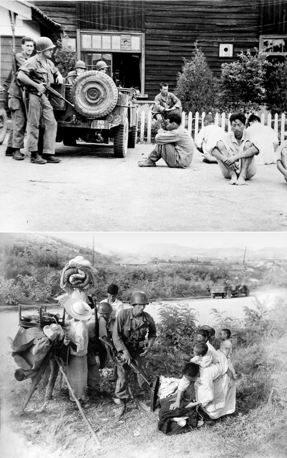 미군이 포로로 잡은 공산주의 ‘혐의자’(위쪽). “공산주의자로 보이는”이라는 사진병의 캡션을 통해 미군이 당시 적과 구별되지 않는 민간인에 대해 혼란스러워했다는 점을 알 수 있다. 아래쪽 사진은 미군에 의해 봇짐을 검색당하는 피란민들. 피란민 여성을 검색하는 모습인데, 사진병은 미군이 피란민을 돕는 것으로 왜곡해 기록했다. <한국전쟁 사진의 역사사회학>