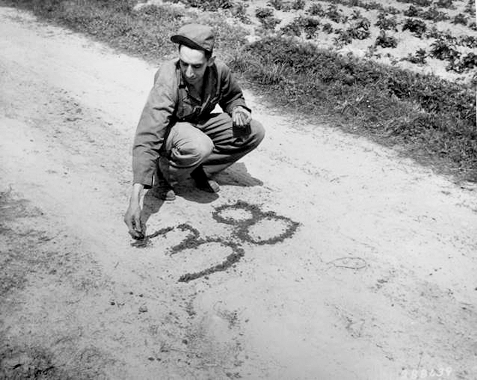1947년 6월 도로 바닥에 ‘38’을 쓴 미군 카메라맨. “미군 사진병이 미군과 소련군의 점령지대를 분할하는 38선을 시각적으로 연출하고자 쓴 것으로 보인다.” 숫자 ‘38’과 미군의 위치가 상식과는 정반대인 점도 어색하다. <한국전쟁 사진의 역사사회학>