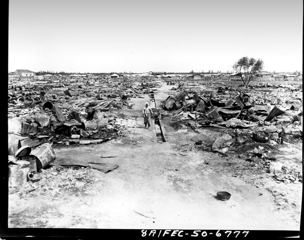 잇단 폭격으로 폐허가 된 경북 포항에서 포착된 한 여인. “모든 것이 파괴된 폐허 속에서 카메라가 있는 곳을 향해 정면으로 응시하는 당당한 모습에서 피해 그 자체의 참혹함뿐만 아니라 피해를 딛고 일어서려는 의지가 돋보인다.” <한국전쟁 사진의 역사사회학>
