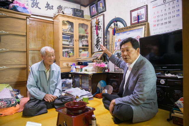 지난 6월6일 전북 남원시 최정범씨(왼쪽) 자택에서 강동원 전 더불어민주당 의원이 빨치산 활동을 설명하고 있다. 김진수 기자